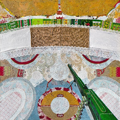 Werkreihe Roter Oktober, 100x100 cm, Mischtechnik auf Brokat