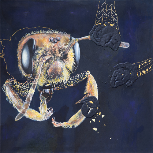 Finde deinen eigenen Ton, 90 x 90 cm, Acryl, Öl, Tusche, Graphit, Stickerei auf Leinwand